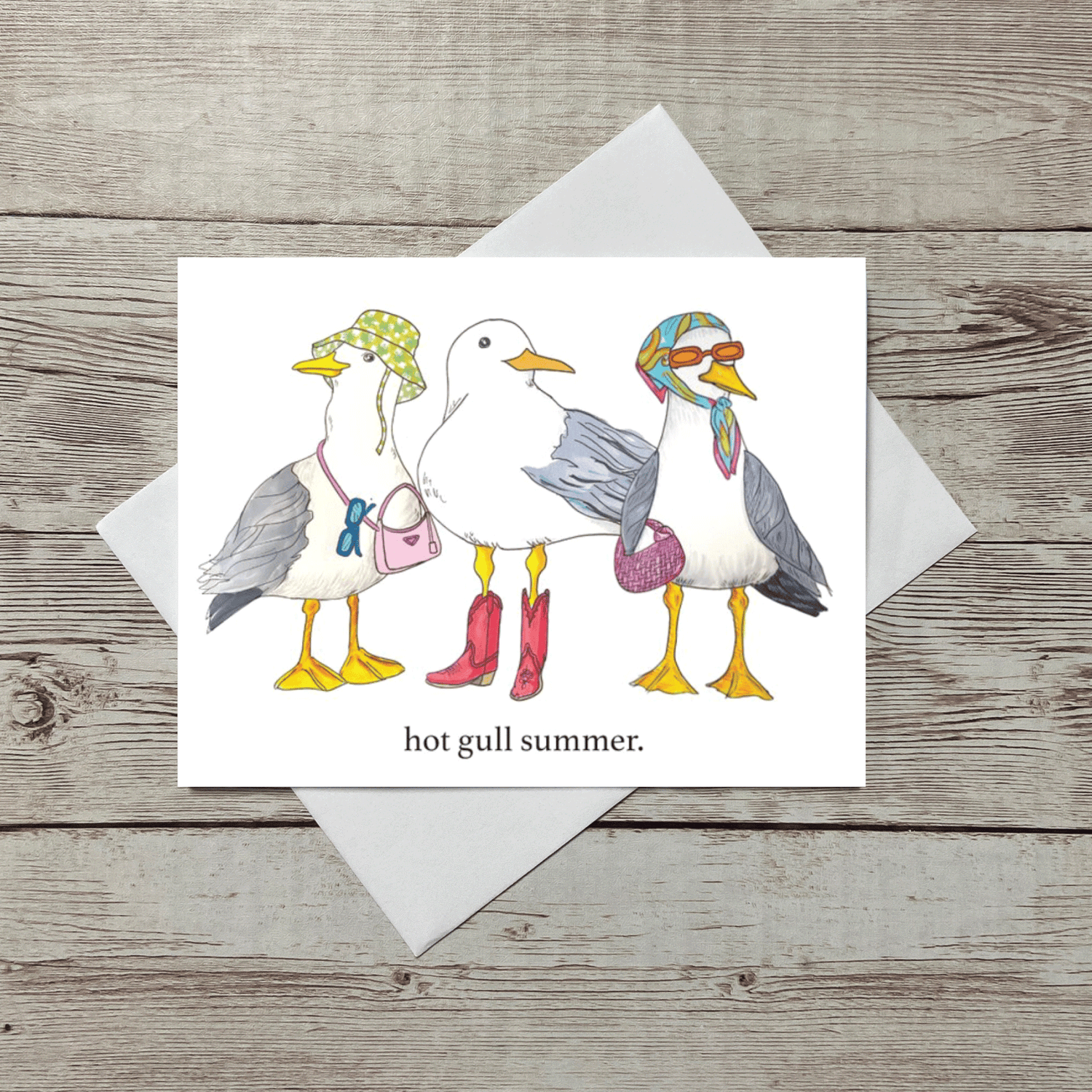 Designed and illustrated by me. This sassy card features an illustration of three fashionable seagulls, with the text "Hot Gull Summer." This is the perfect thinking of you, birthday, or thank you card.
