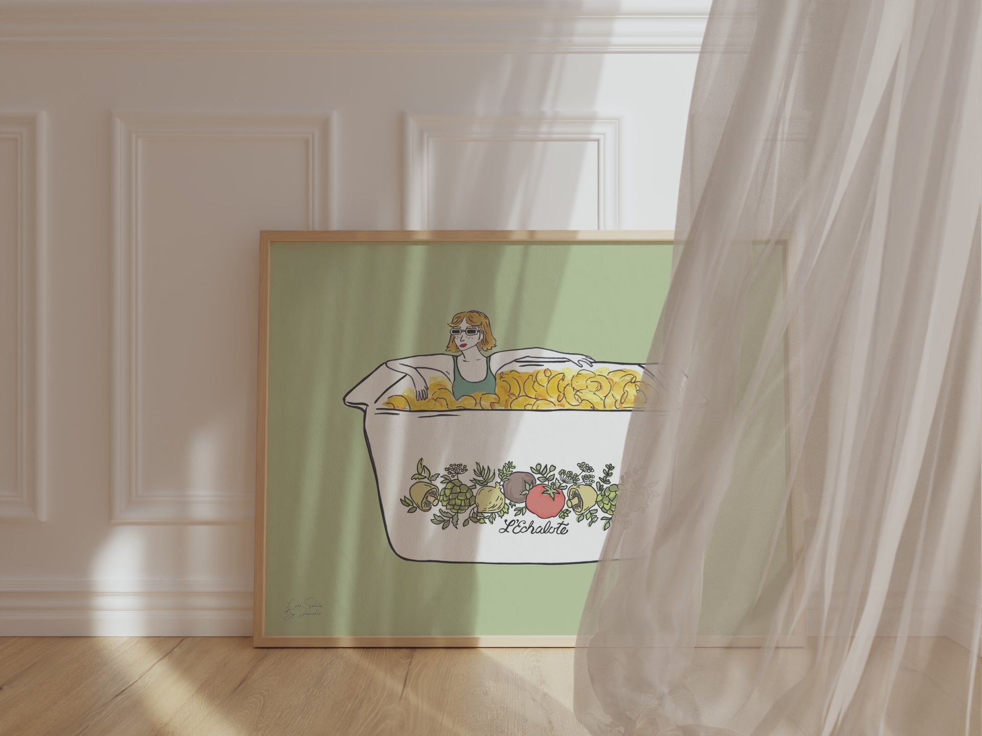 Designed and illustrated by me. This sweet print features an illustration of a girl sitting in a vintage corning ware dish featuring the Spice of Life pattern, of Mac and cheese. This print is perfect for a kitchen or dining area!